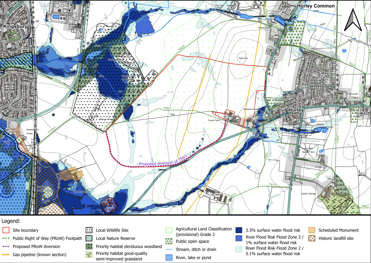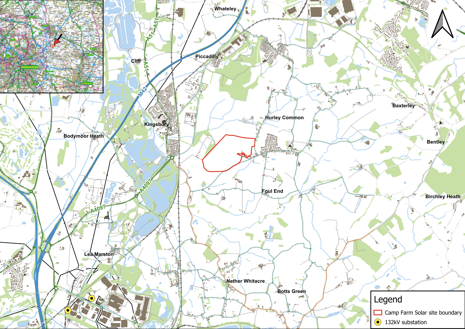 Our proposals include a solar farm at Camp Farm and Battery Energy Storage System to the northwest of the village of Hurley, with an expected generating capacity of up to 49.9 megawatts (MW).