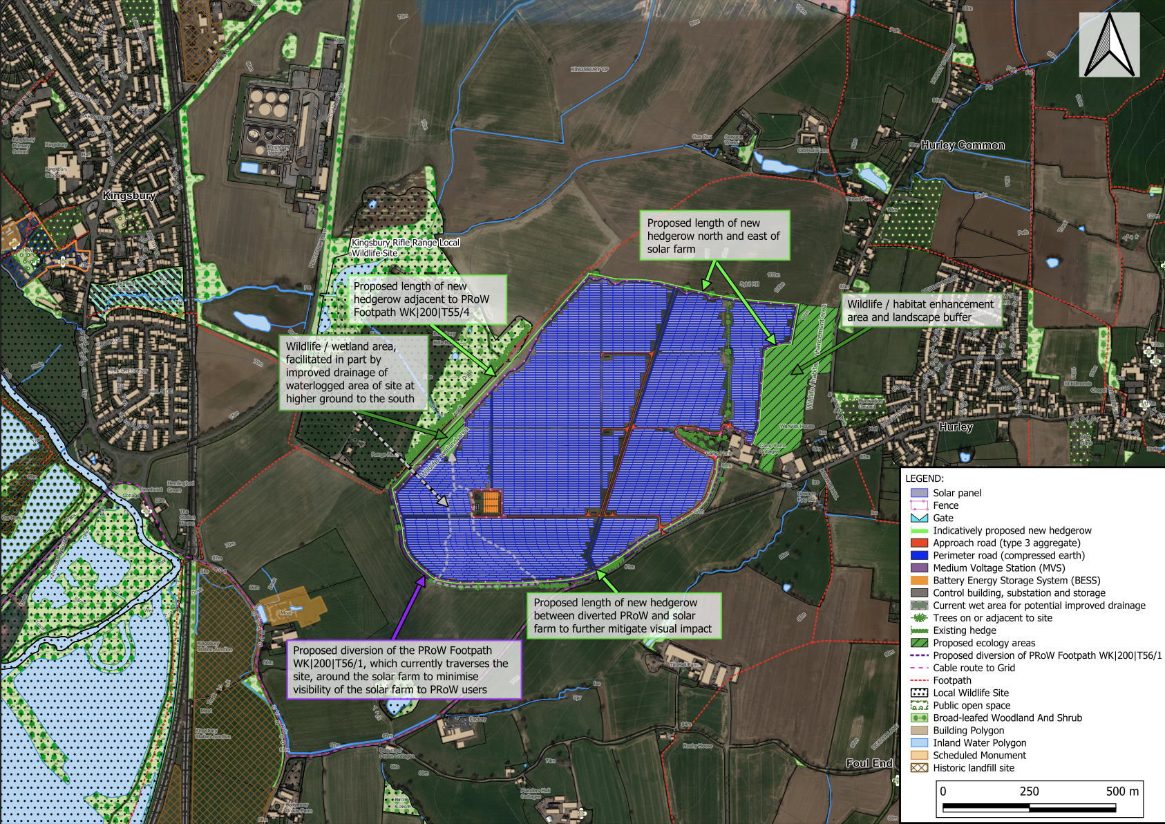 We are proposing to divert the existing Public Right of Way WK|200|T56/1 that currently runs through the middle of the site around the southern edge of the site. The diverted route would be 10m wide and new species-rich hedgerow would be planted between it and the solar farm. Plan 4 shows the proposed ProW diversion route. Click on the link to enlarge the plan.